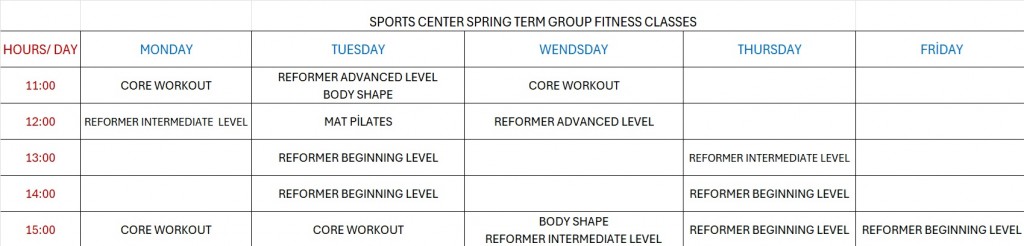 Sports Center Pilates and Studio Classes Fall Term Days and Hours