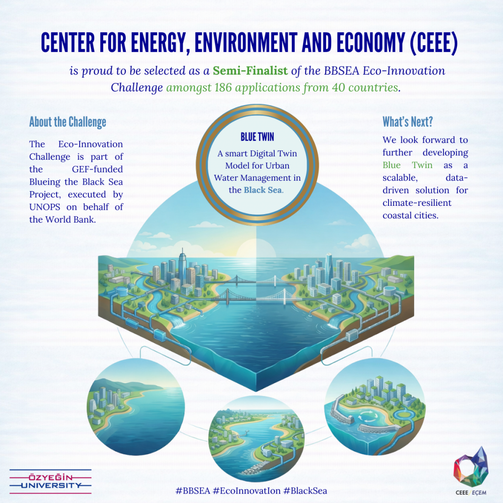 We’re excited to share that Özyeğin University’s Center for Energy, Environment and Economy (CEEE) has been selected as a Semi-Finalist for the Blueing the Black Sea Eco-Innovation Challenge with our project BLUE TWIN - A Cyber-Physical Hybrid Model: Integrating Digital Twins and Nature-Based Solutions for Water Waste Management in the Black Sea.