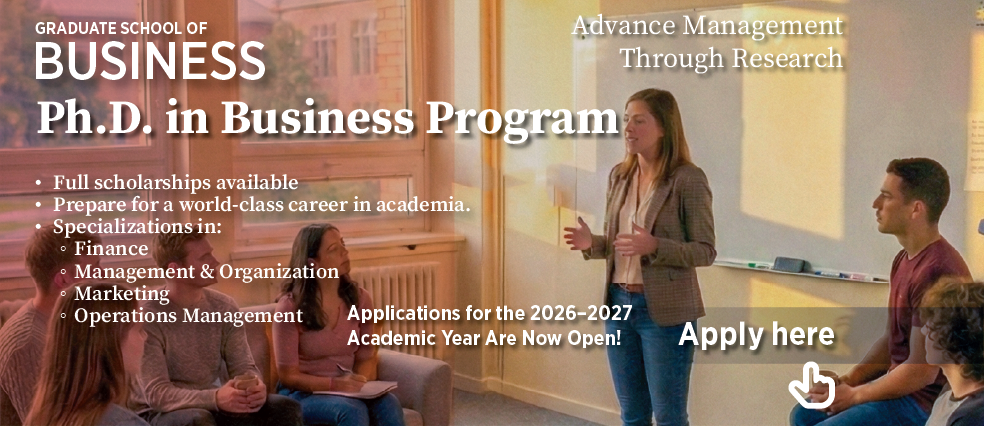 Applications are now open for the Fall 2026–2027 Academic Year of our Ph.D. in Business Administration Program. This program is specifically designed for aspiring scholars who seek to pursue academic careers in business and to develop the rigorous theoretical and methodological foundation required to produce impactful, high-quality scientific research within their chosen field of specialization.