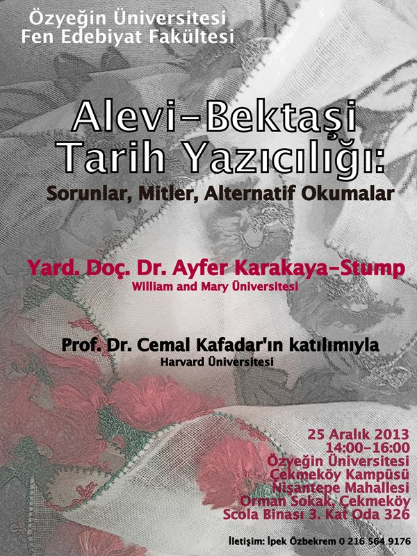 Seminar Series of the Faculty of Arts and Sciences will be launched on 25 December 2013 at 14:00 at Özyeğin University Çekmeköy Campus, Scola building Room 326 with a seminar by Ayfer Karakaya Stump (William and Mary College) who will deliver a talk entitled "Alevi-Bektashi History Writing: Problems, Myths and Alternative Readings". Cemal Kafadar from Harvard University will contribute as a discussant.