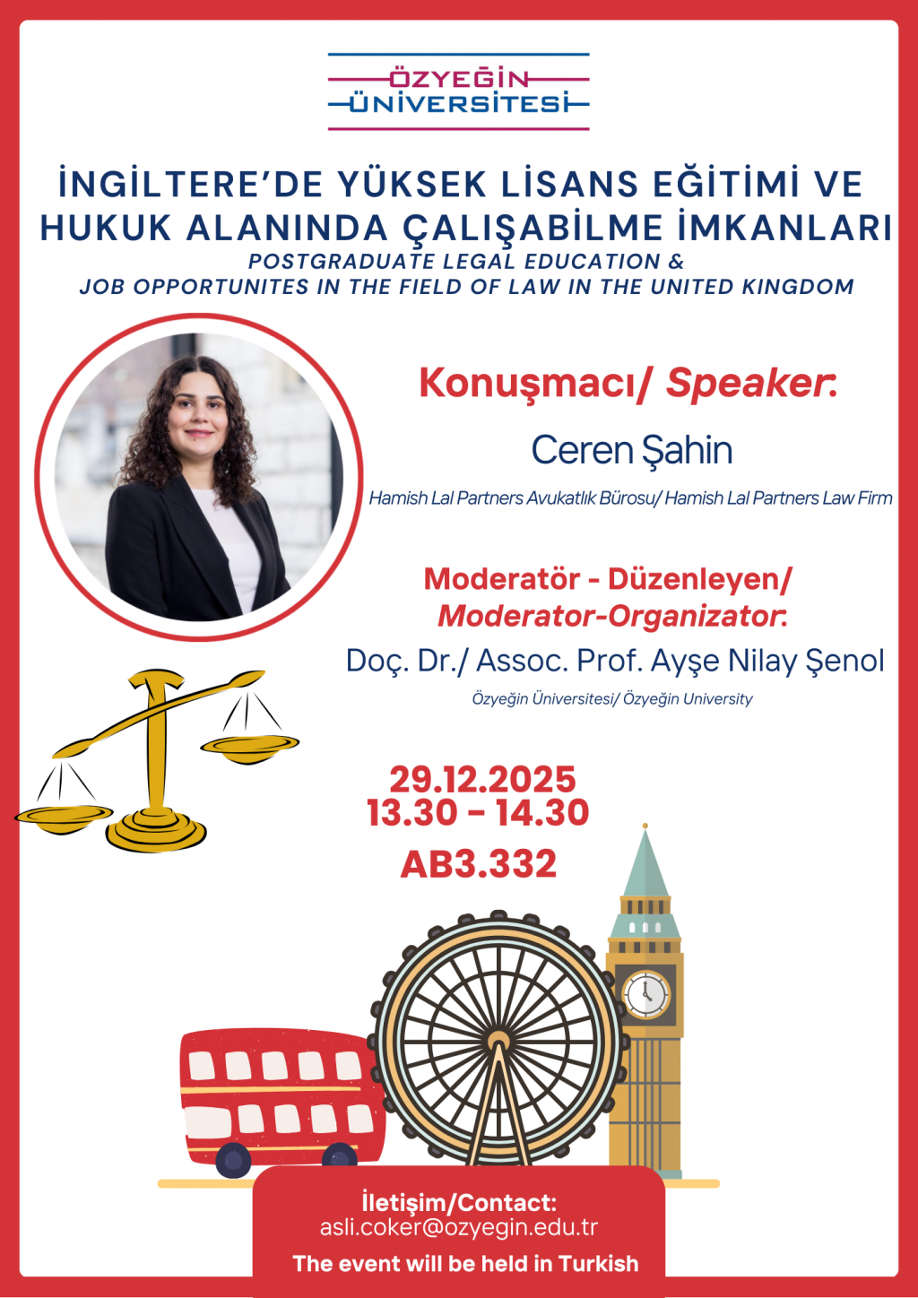 The event titled “Postgraduate Legal Education & Job Opportunities in the Field of Law in the United Kingdom” organized by the Özyeğin University Faculty of Law, will be held in person in Room AB3. 332 on Monday, 29 December 2025, between 13:30 and 14:30.