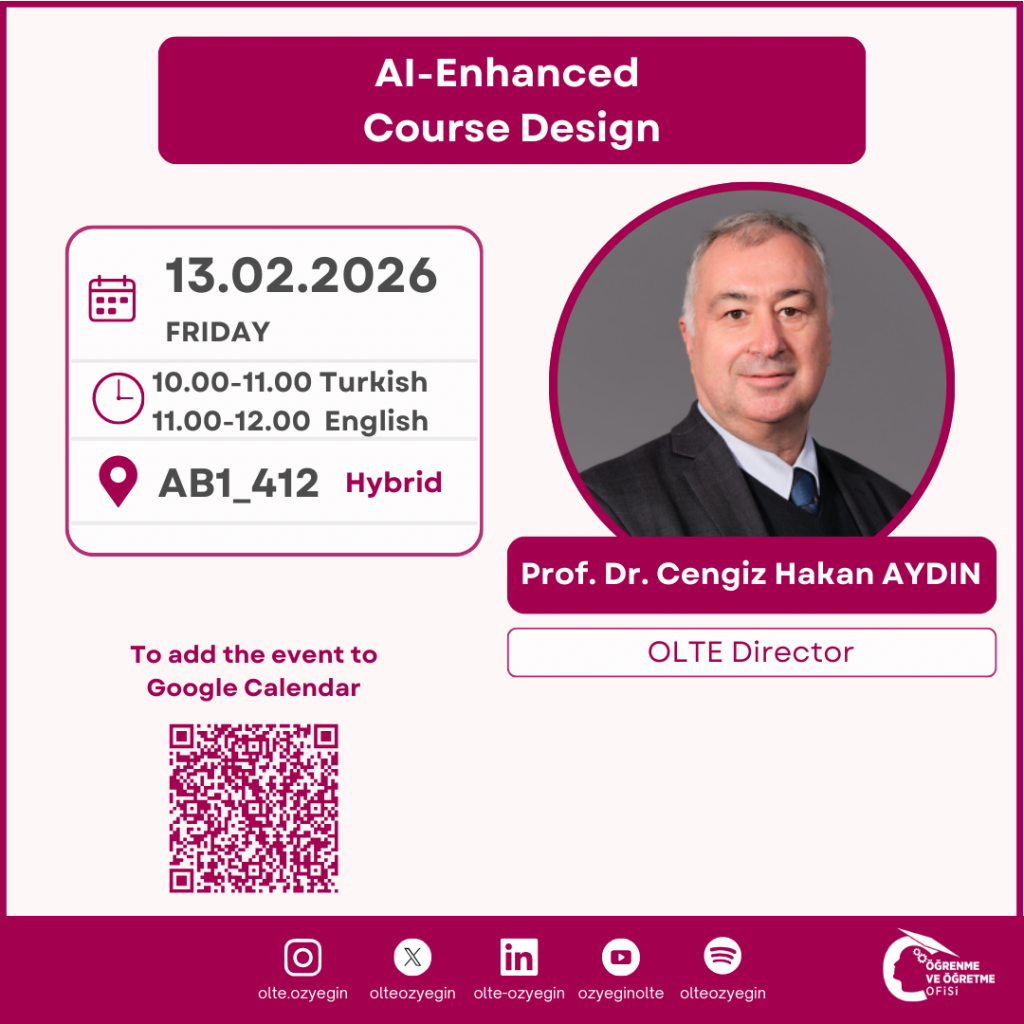 In this event titled AI-Enhanced Course Design, organized for our faculty members, we will explore how artificial intelligence can be used as a supportive tool in course design processes. The event focuses on how faculty can make use of AI while planning, structuring, and developing their courses, and on exploring AI use cases that are appropriate for different course contexts.