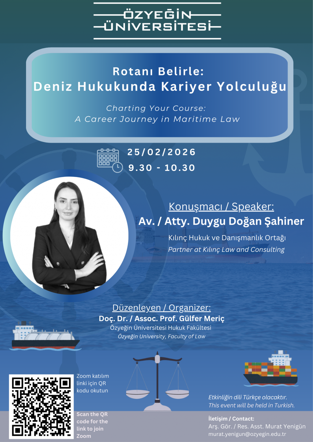 The event entitled “Charting Your Course: A Career Journey in Maritime Law” organized by Özyeğin University Faculty of Law, will be held online via Zoom on Wednesday, 25 February 2026, between 9:30 and 10:30.