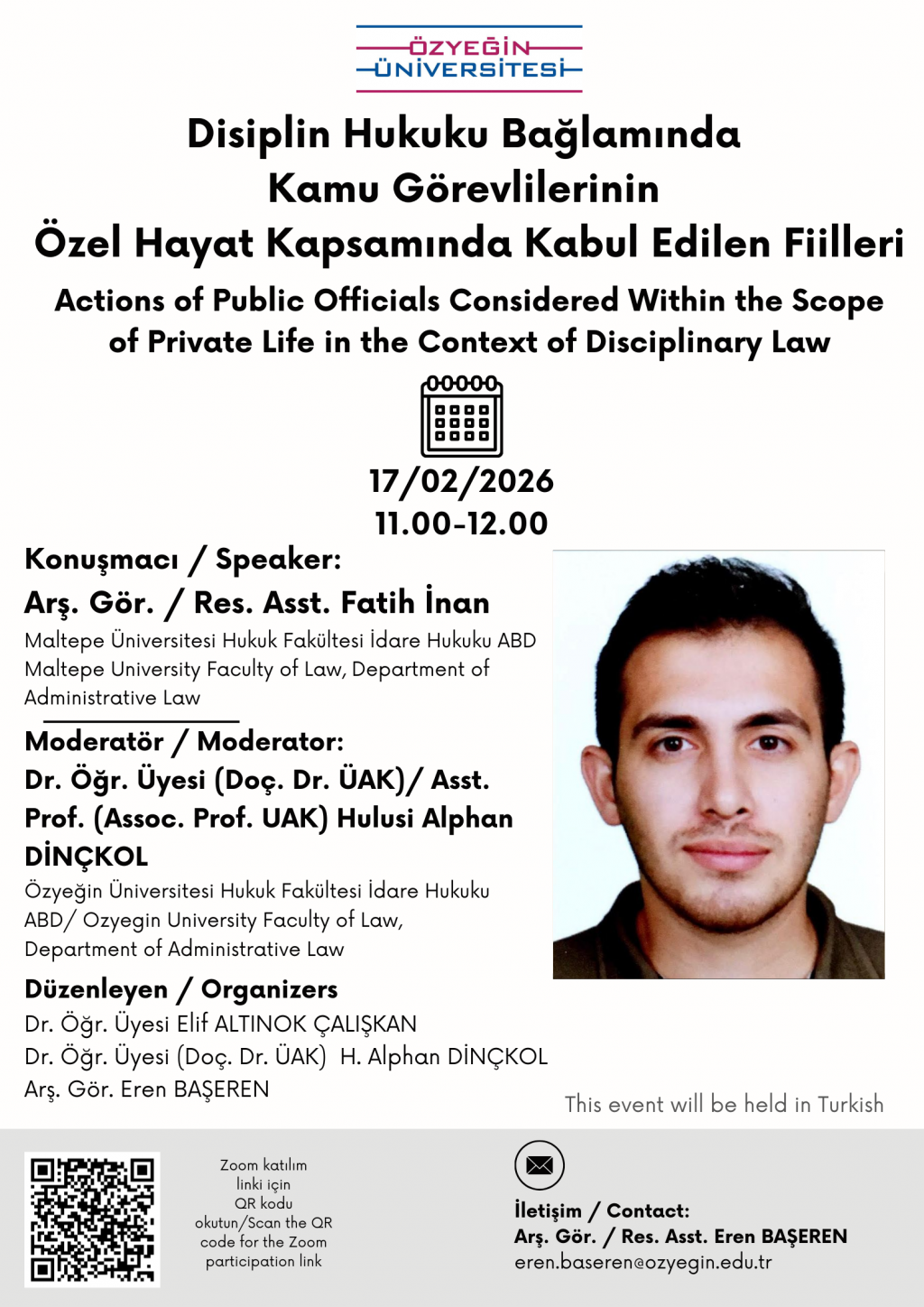 The event titled “Actions of Public Officials Considered Within the Scope of Private Life in the Context of Disciplinary Law” organized by Özyeğin University Faculty of Law, will be held online via Zoom on Tuesday, 17 February 2026, between 11:00 and 12:00.