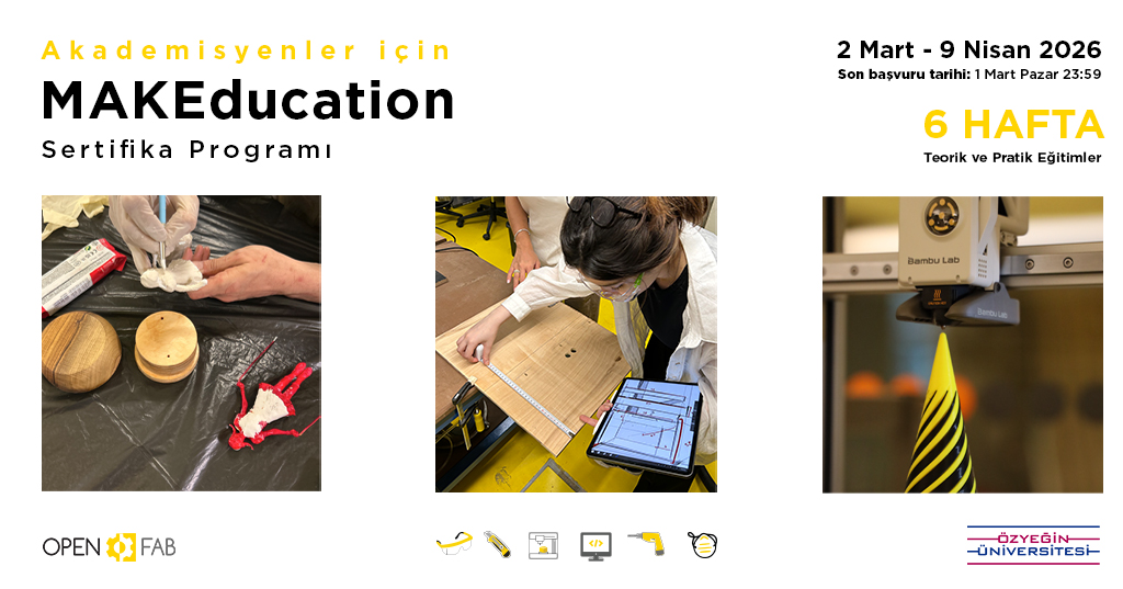 📢OPENFAB bünyesinde yürütülen akademisyenlerin katılımına açık program; teorik bilgi ile pratik uygulamaları bir araya getiren altı haftalık bir deneyim sunmaktadır. Program sürecinde katılımcılar FabLab alanı içerisindeki el aletleri, üç boyutlu yazıcıları ve malzemeleri kullanmayı öğrenecektir. Katılımcılar süreç boyunca edindikleri teorik ve pratik bilgileri kendi disiplinlerine, derslerine ve araştırmalarına entegre edebilecekleri uygulama temelli çıktılar geliştirecektir.