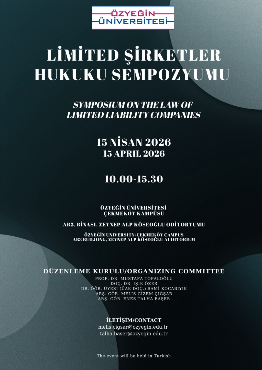 The symposium titled “The Law of Limited Liability Companies'' organized by the Faculty of Law at Özyeğin University, will be held in person on Wednesday, 15 April 2026, between 10:00 and 15:30, at Zeynep Alp Köseoğlu Auditorium (AB3 150), AB3 Building, Özyeğin University Çekmeköy Campus.