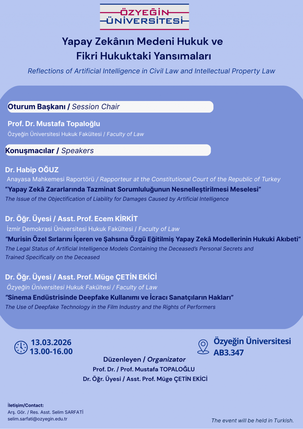 The event titled “Reflections of Artificial Intelligence in Civil Law and Intellectual Property Law”, organized by the Faculty of Law at Özyeğin University, will be held in person on Friday, 13 March 2026, between 13:00 and 16:00, in Room AB3 347.