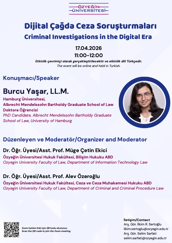 The event titled ''Criminal Investigations in the Digital Era'', organized by the Faculty of Law of Özyeğin University, will be held online via Zoom on Monday, December 1, 2025, between 11:00 a.m. and 12:00 p.m.