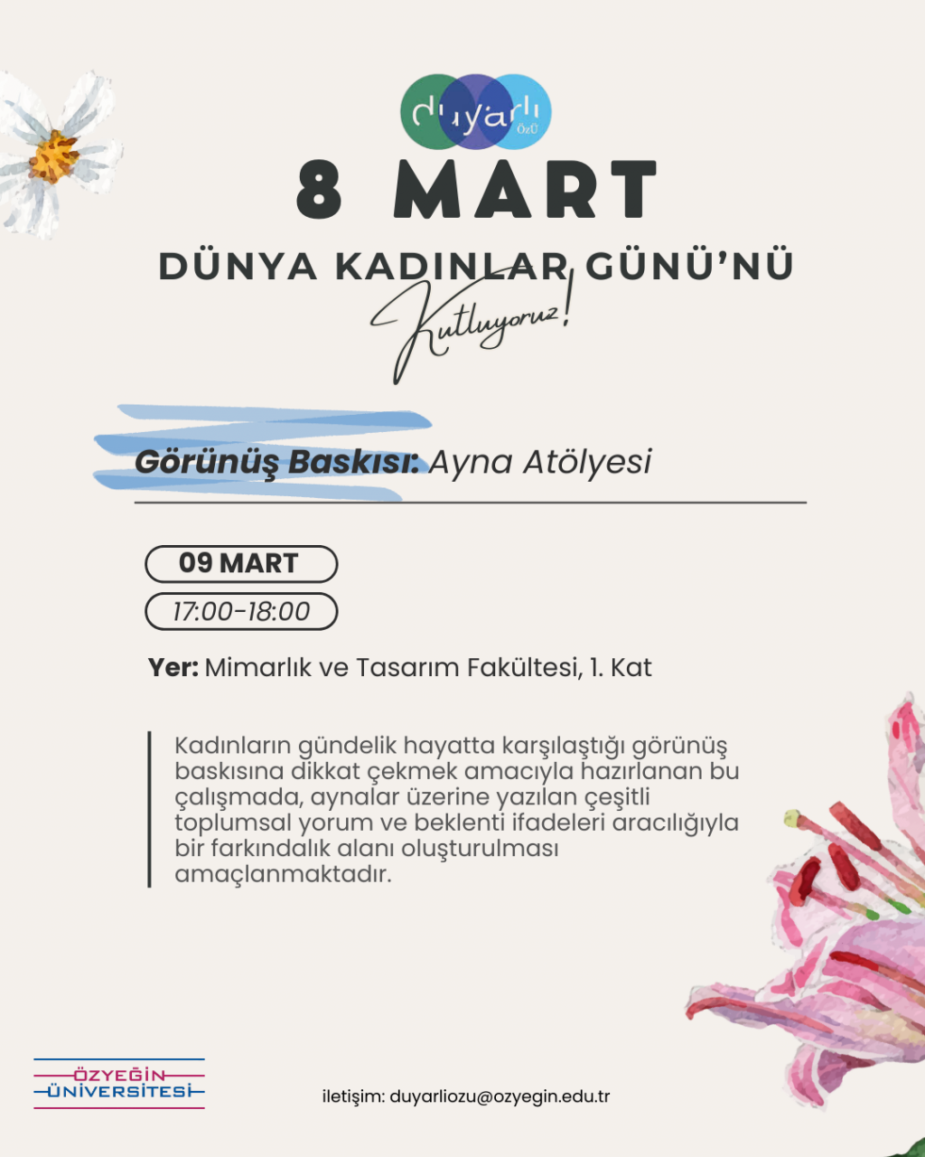 Appearance Pressure: Mirror Workshop, part of the International Women’s Day Week Events organized by the students of the Women’s Rights Project Team within the Duyarlı ÖzÜ Volunteering Program, will take place on Monday, March 09, 2026 between 17:00–18:00 at the Faculty of Architecture, 1st Floor.