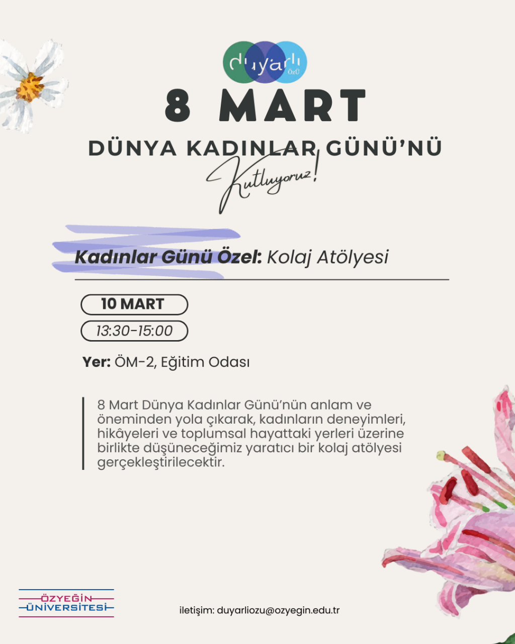 Women’s Day Special: Collage Workshop, part of the International Women’s Day Week Events organized by the students of the Women’s Rights Project Team within the Duyarlı ÖzÜ Volunteering Program, will take place on Tuesday, March 10, 2026 between 13:30–15:00 at Student Center -2, Training Room.