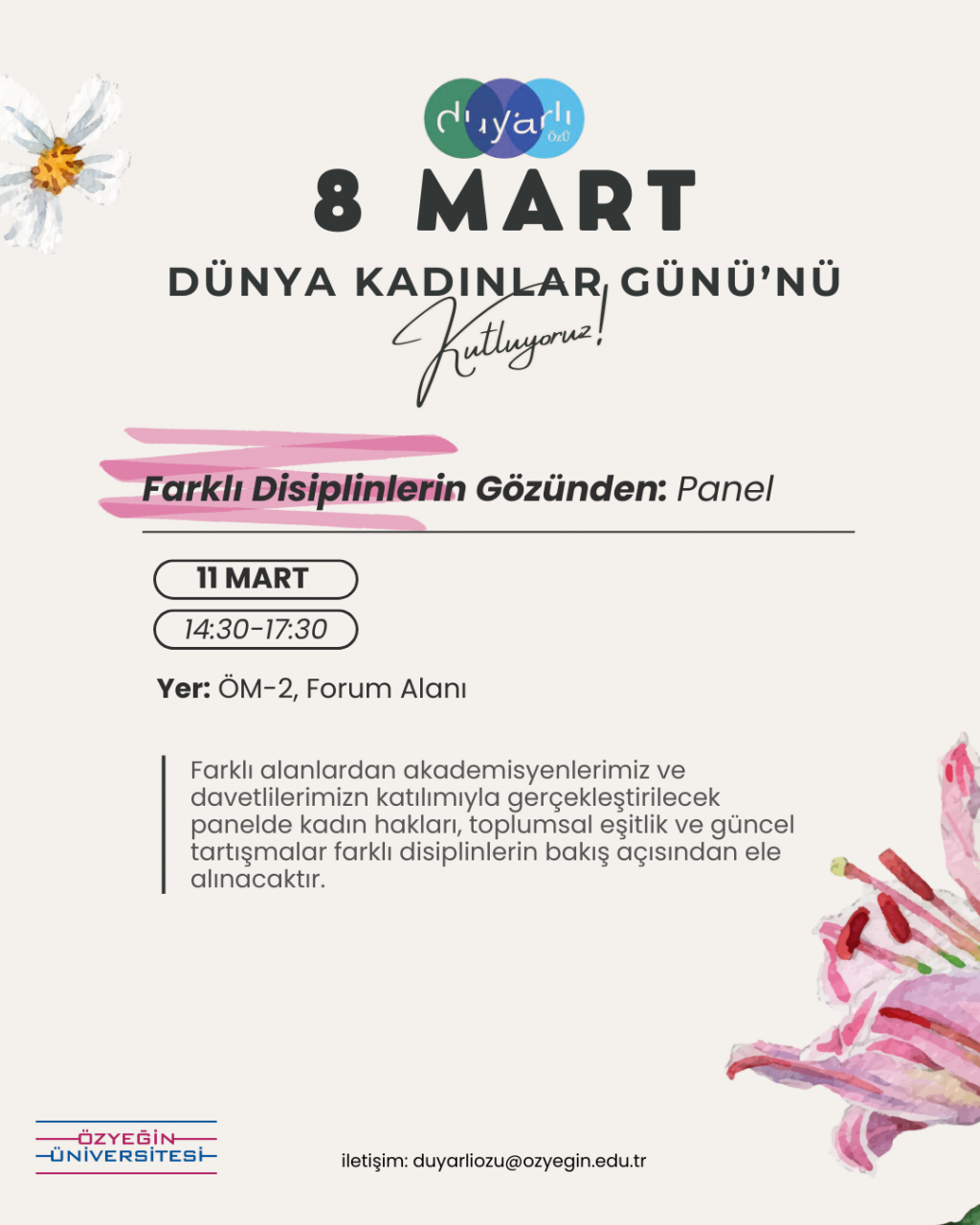 Perspectives from Different Disciplines: Panel, part of the International Women’s Day Week Events organized by the students of the Women’s Rights Project Team within the Duyarlı ÖzÜ Volunteering Program, will take place on Wednesday, March 11, 2026 between 14:30–17:30 at Student Center -2, Forum Area.