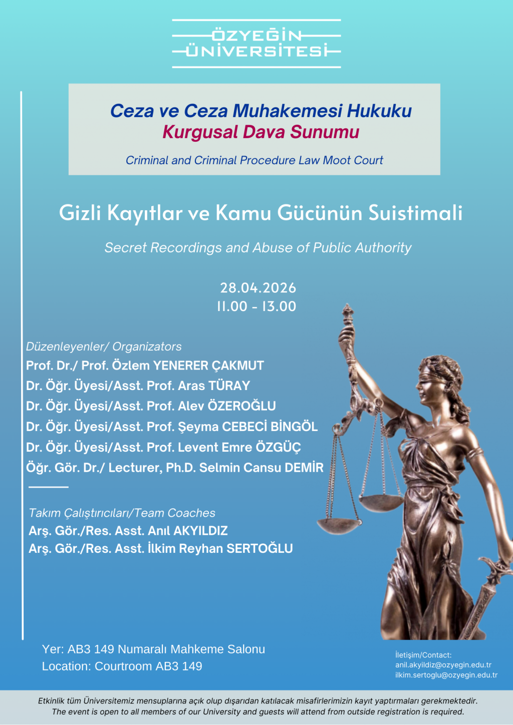 The moot court titled “Secret Recordings and Abuse of Public Authority”, in the field of Criminal and Criminal Procedure Law and organized by the Faculty of Law at Özyeğin University, will be held in person on Tuesday, 28 April 2026, between 11:00 and 13:00, at the Courtroom (AB3 149).