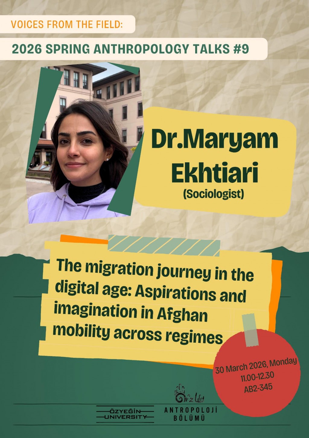 You are invited to Dr. Maryam Ekhtiari`s talk on migration in the digital age, as part of the Voices from the Field: Spring 2026 Anthropology Talks Series. The talk will be delivered on Monday, 30 March at 11:00 in AB2.345. The event will be held in English.