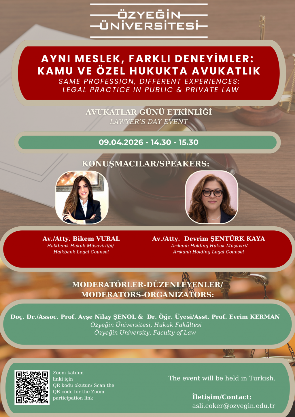 The event titled “Same Profession, Different Experiences: Legal Practice in Public and Private Law”, organized by the Faculty of Law at Özyeğin University on the occasion of Lawyers’ Day, will be held online via Zoom on Thursday, 9 April 2026, between 14:30 and 15:30.