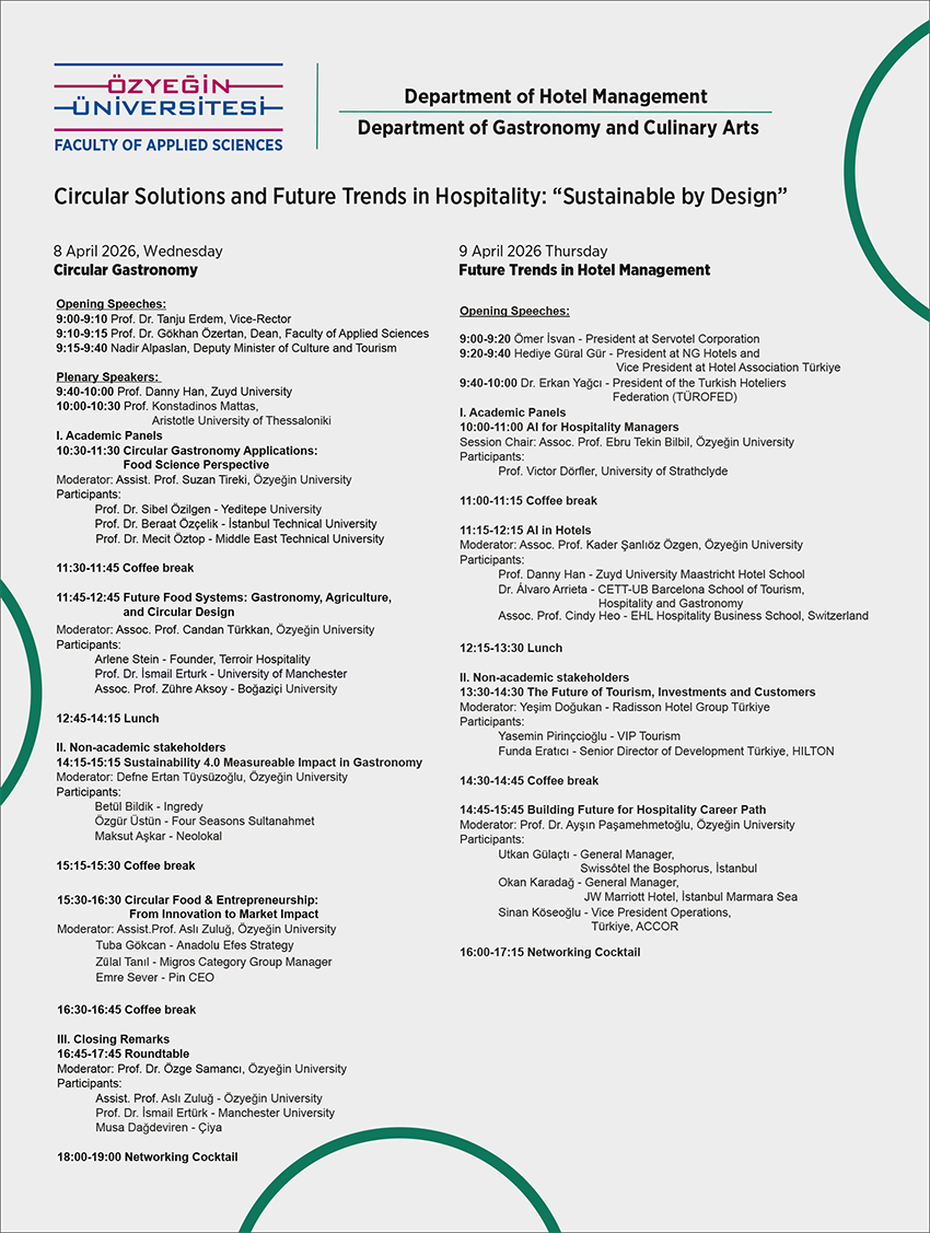 The conference titled “Sustainability by Design - Circular Solutions and Future Trends in Gastronomy and Hospitality” organized by the Faculty of Applied Sciences at Özyeğin University, will take place on April 8–9, 2026, at the Zeynep Alp Köseoğlu Auditorium on the Çekmeköy Campus.