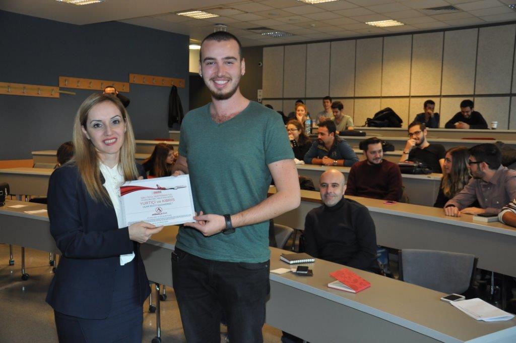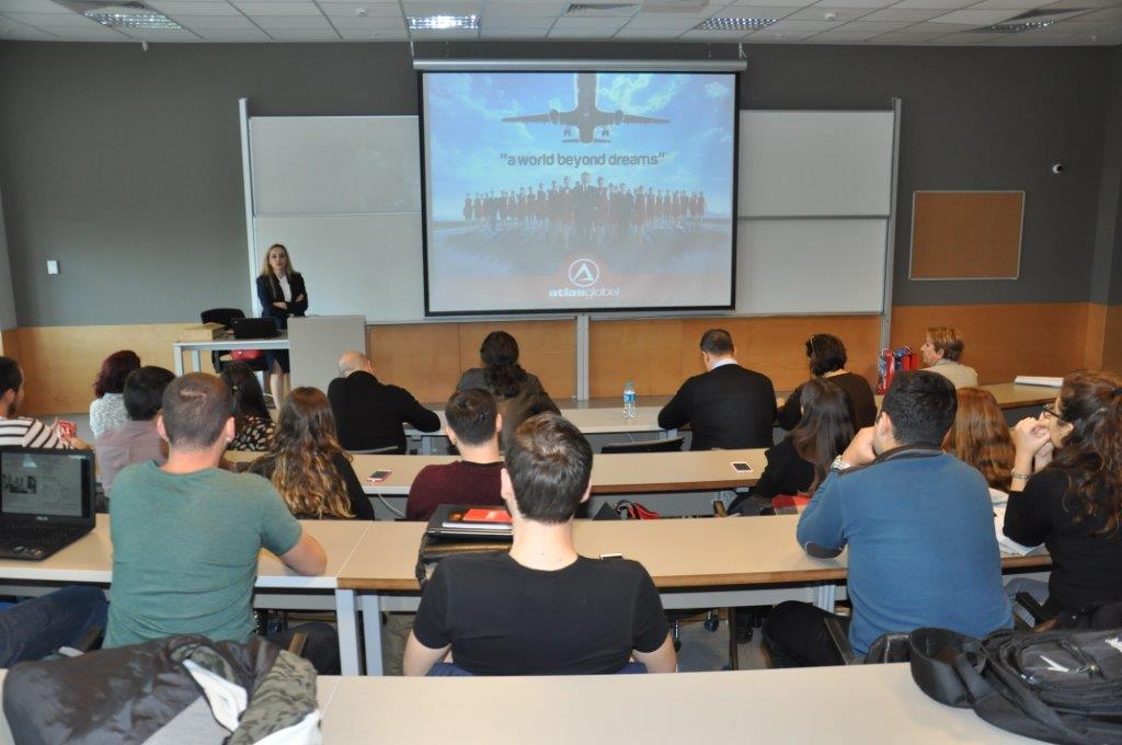 The School of Aviation at Özyeğin University organized a seminar on Aviation Planning and Functions on December 1st, 2015. Ms. Semra Erener Özalçın, Chief Commercial Officer at AtlasGlobal Airlines, joined us as our invited speaker to share her knowledge and experience with our students. Ms. Özalçın provided an overview about AtlasGlobal Airlines including its operational structure and services and offered in-depth information to our students about aviation sector and airlines and their main functions. The seminar was followed by a question and answer session in which Ms. Özalçın asked questions to our students and presented an AtlasGlobal Model Aircraft to students who gave the right answers. Ms. Özalçın also held a draw in which winners received round-trip tickets or simulator flight rides.