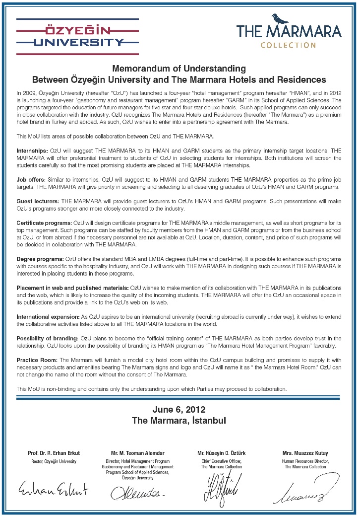 Therefore, the Özyeğin University School of Applied Sciences and the Marmara Collection Group signed a memorandum of understanding on June 6, 2012, entailing preferential treatment to students of OzU in selecting students for internships, priority in screening and selecting to all deserving graduates of OzU's HMAN and GARM programs for open positions at The Marmara Hotels, recruitment of eligible graduates as Management Trainee in exchange of certificate trainings offered by OzU to The Marmara Collection Group employees, inviting experienced and professional senior managers of the Marmara Collection Group to give lectures as guest speakers or to analyze business cases with students, as well as development of joint R&D projects to meet the needs of the hospitality industry.