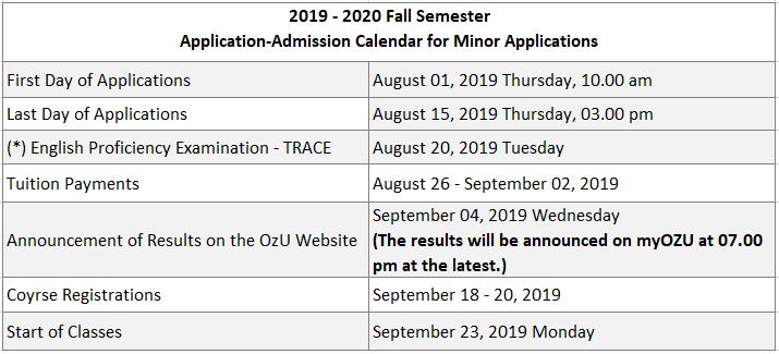 1. Academic Length: Students may apply to take on a minor at the earliest at the beginning of their third semesters and at the latest at the beginning of their sixth semesters of their undergraduate studies.Students who had previously transferred to Özyeğin University’s undergraduate programs from other institutions through either horizontal or vertical transfers must have spent at least a semester in their majors in order to apply for a minor.