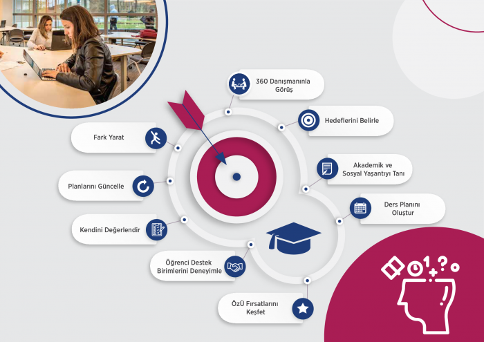 Öğrenci Gelişimi ve Deneyimi Bölümü'nde yer alan 360 Danışmanlık; öğrencilerin, üniversite yaşamına adım atmaları ile başlayan süreçte öz-yeterlik geliştirmeleri, yatkın oldukları alanları keşfetmeleri, potansiyellerini kariyer hedeflerine dönüştürmeleri ve üniversite kaynaklarını bu amaç doğrultusunda kullanabilmeleri için proaktif danışma yöntemini uygular.