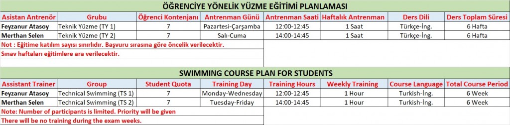 Yüzme tekniğini geliştirmek isteyen öğrencilerimiz için Spor Merkezi Aktivite Planı'nda yer alan yüzme kurslarımız başlıyor. Aşağıdaki tabloda size uygun olan kurs grubunu seçin ve aşağıda belirtilen mail adresine kurs grubunuzu yazarak kaydınızı gerçekleştirin.