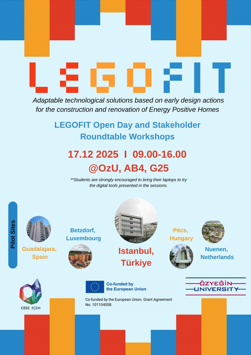 Özyeğin Üniversitesi, Enerji, Çevre ve Ekonomi Merkezi (CEEE/EÇEM) tarafından yürütülen Horizon Europe LEGOFIT Projesi’nin Türkiye Pilotu kapsamındaki çalışmalar çerçevesinde “LEGOFIT Open Day and Stakeholder Roundtable Workshops / LEGOFIT Açık Gün ve Paydaş Yuvarlak Masa Çalıştayı” etkinliği gerçekleştirilecektir. Etkinlik, 17 Aralık 2025 Çarşamba günü, Özyeğin Üniversitesi Mimarlık Fakültesi, Akademik Bina 4, G25 numaralı salonda düzenlenecektir.