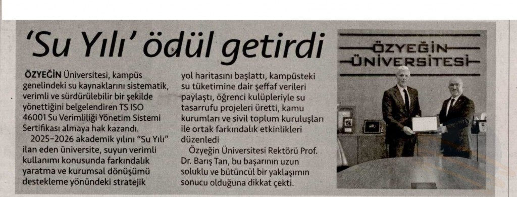 ÖZYEĞİN Üniversitesi, kampüs genelindeki su kaynaklarını sistematik, verimli ve sürdürülebilir bir şekilde yönettiğini belgelendiren TS ISO 46001 Su Verimliliği Yönetim Sistemi Sertifikası almaya hak kazandı.