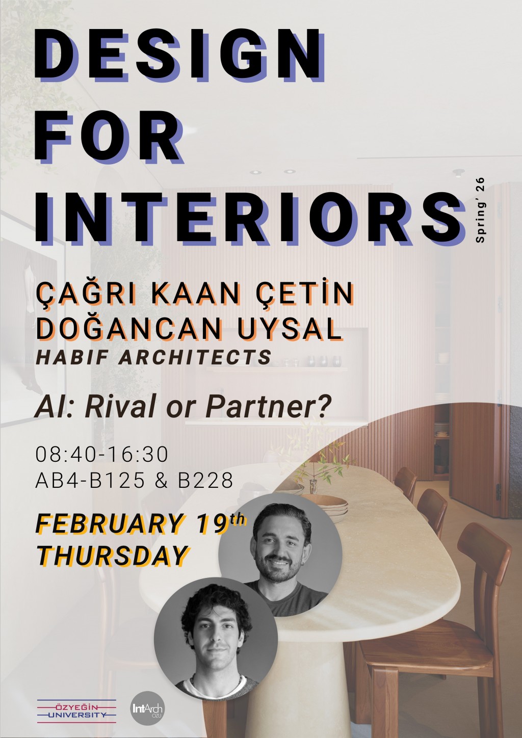 Bahar Dönemi kapsamında, yapay zekâ ile tasarım geliştirme süreçlerine odaklanan bu özel workshop, 19 Şubat tarihinde 08:40 – 16:30 saatleri arasında gerçekleştirilecektir. "Yapay Zeka Rakip mi Ortak mı?" başlığı altında düzenlenecek olan ve Habif Mimarlık’tan Mimar Çağrı Kaan Çetin ile İç Mimar Doğancan Uysal’ın yürütücülüğünü üstlendiği bu bir günlük yoğun programda; yapay zekânın yaratıcı süreçlerdeki dönüştürücü rolü mercek altına alınacak ve tasarım disiplinleri için bir rakip mi yoksa güçlü bir çözüm ortağı mı olduğu sorusuna yanıt aranacaktır.