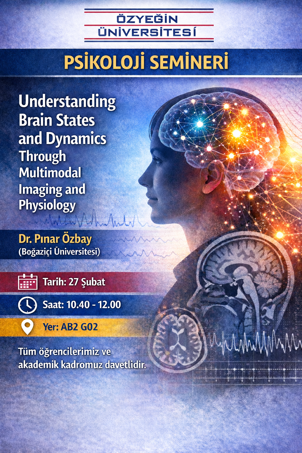 Psikoloji Bölümü tarafından düzenlenen seminer kapsamında, Dr. Pınar Özbay (Boğaziçi Üniversitesi) “Understanding Brain States and Dynamics Through Multimodal Imaging and Physiology” başlıklı konuşmasını gerçekleştirecektir.