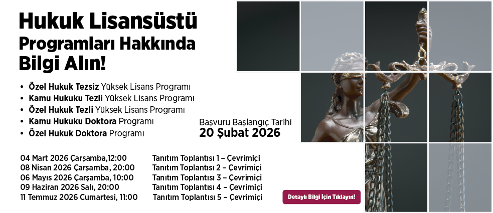 2026-2027 Akademik Yılı Güz Dönemi Hukuk Lisansüstü Programları için 20 Şubat – 24 Temmuz 2026 tarihleri arasında başvurular alınacaktır.