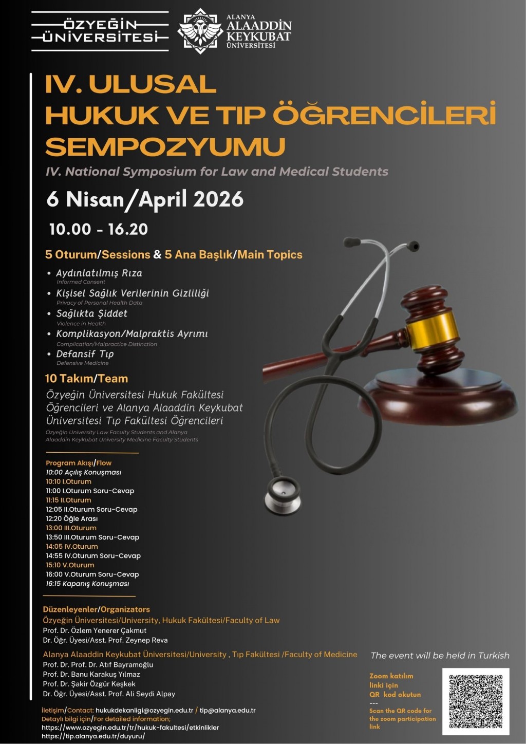 Özyeğin Üniversitesi Hukuk Fakültesi ve Alanya Alaaddin Keykubat Üniversitesi Tıp Fakültesi tarafından düzenlenen, ''IV. Ulusal Hukuk ve Tıp Öğrencileri Sempozyumu'' 6 Nisan 2026 Pazartesi günü saat 10.00 - 16.20 aralığında zoom üzerinden online olarak gerçekleşecektir.