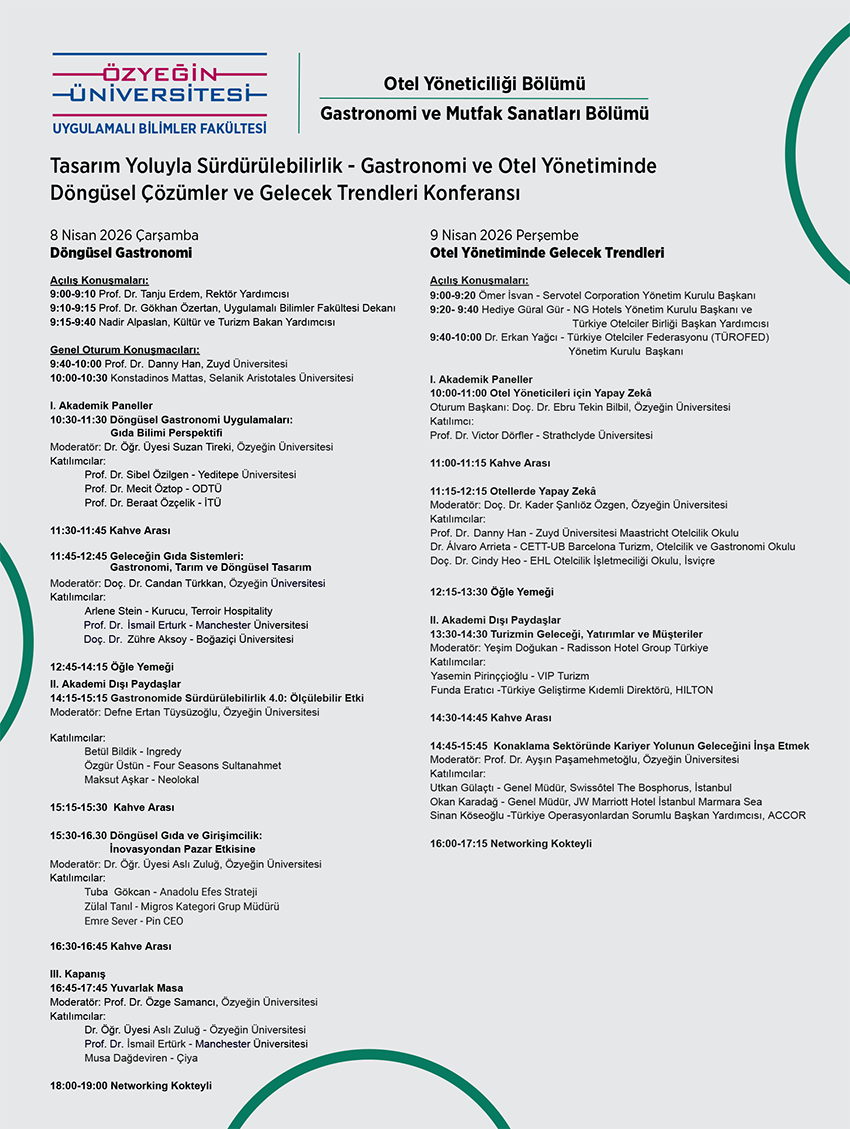 Özyeğin Üniversitesi Uygulamalı Bilimler Fakültesi tarafından düzenlenen "Tasarım Yoluyla Sürdürülebilirlik - Gastronomi ve Otel Yönetiminde Döngüsel Çözümler ve Gelecek Trendleri" başlıklı konferans, 8–9 Nisan 2026 tarihlerinde Çekmeköy Kampüsü’nde, Zeynep Alp Köseoğlu Oditoryumu’nda gerçekleşecektir.