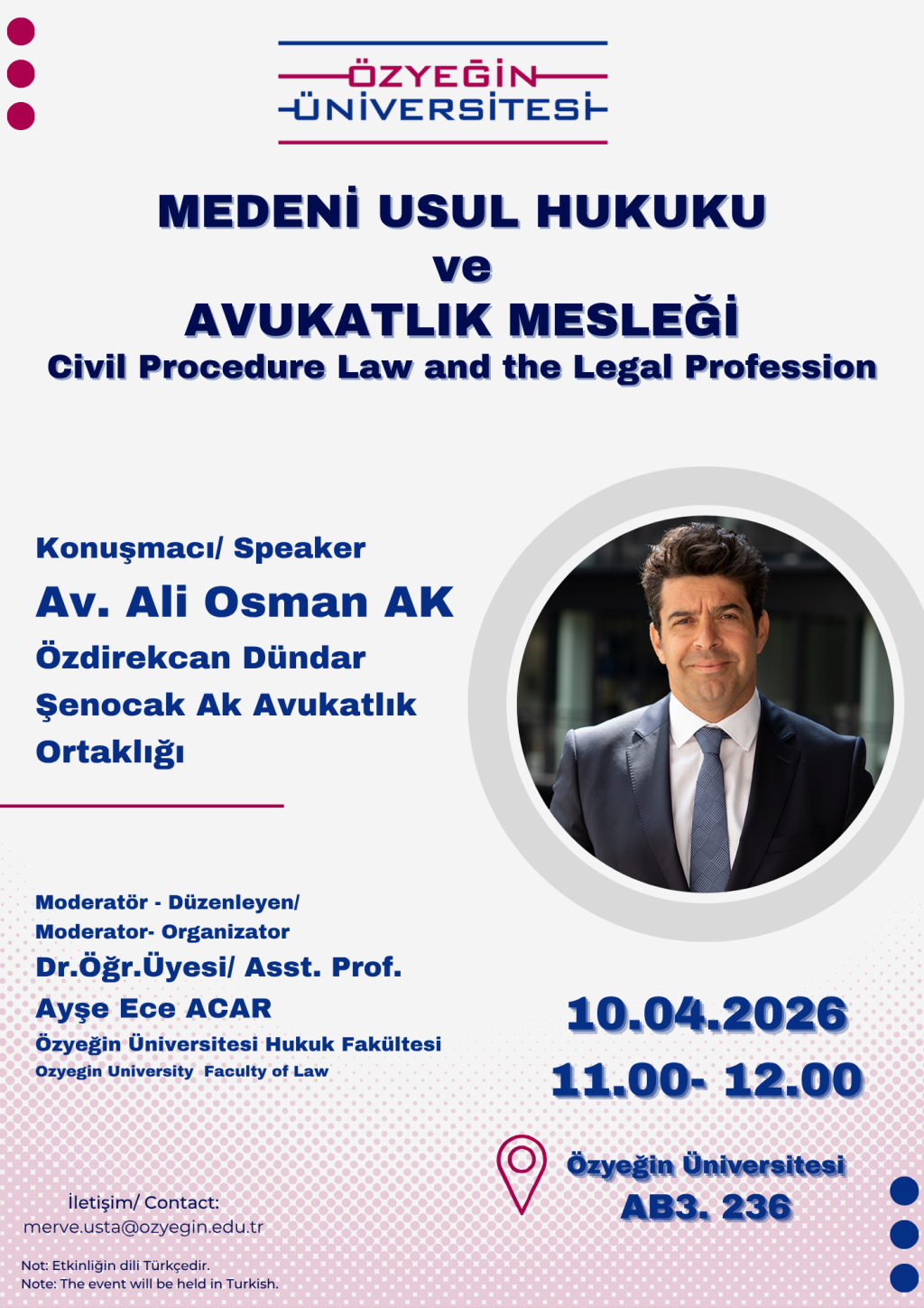 Özyeğin Üniversitesi Hukuk Fakültesi tarafından düzenlenen ''Medeni Usul Hukuku ve Avukatlık Mesleği” adlı etkinlik 10 Nisan 2026 Cuma günü saat 11.00-12.00 aralığında AB3. 236 numaralı salonda yüz yüze olarak gerçekleştirilecektir.