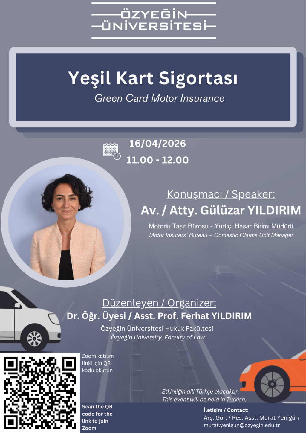 Özyeğin Üniversitesi Hukuk Fakültesi tarafından düzenlenen "Yeşil Kart Sigortası" adlı etkinlik 16 Nisan 2026 Perşembe günü saat 11.00-12.00 aralığında zoom üzerinden online olarak gerçekleştirilecektir.