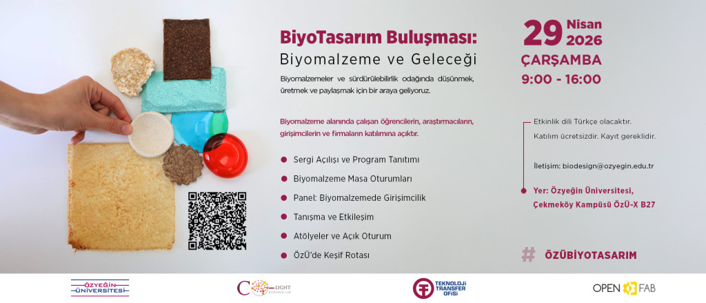 Biyomalzemeler ve sürdürülebilirlik odağında düşünmek, üretmek ve paylaşmak için bir araya geliyoruz. Özyeğin Üniversitesi'nin ev sahipliği yapacağı 'BiyoTasarım Buluşması: Biyomalzeme ve Geleceği' 29 Nisan 2026 Çarşamba günü Çekmeköy Kampüsü'nde gerçekleşecektir. Öğrenciler, araştırmacılar, girişimciler ve sürdürülebilirlik alanında çalışan herkesin katılımına açıktır. Kontenjan sınırlı olup, katılımcıların kayıt yaptırması gerekmektedir. Sorularınız için biodesign@ozyegin.edu.tr adresinden etkinlik yürütücüleri ile iletişime geçebilirsiniz.