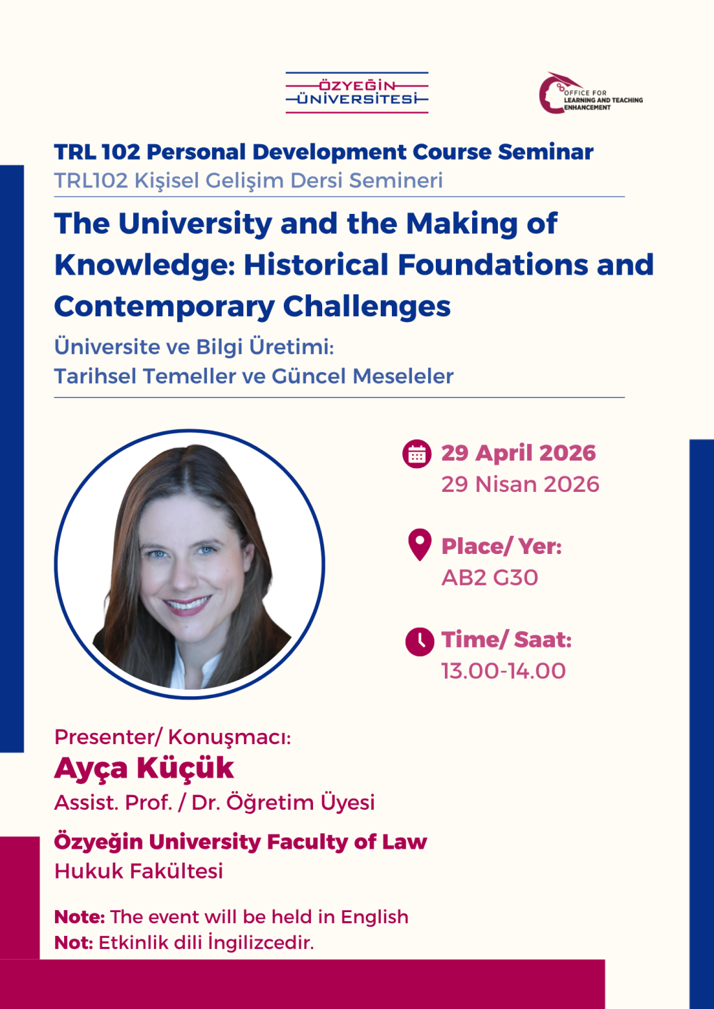 Üniversite ve Bilgi Üretimi:Tarihsel Temeller ve Güncel Meseleler isimli seminer Hukuk Fakültesi’nden Dr. Ayça Küçük tarafından gerçekleştirilecektir.