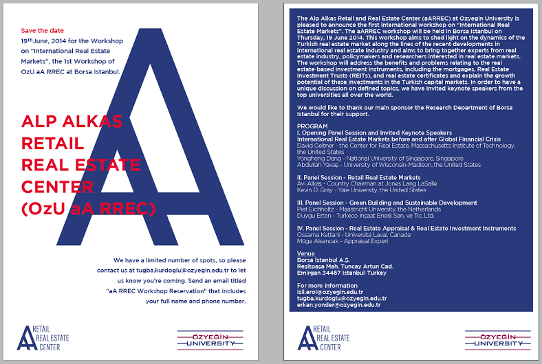 Özyegin Üniversitesi Alp Alkaş Perakende ve Gayrimenkul Merkezi tarafından düzenlenen “Uluslararası Gayrimenkul Piyasaları” başlıklı uluslararası çalıştay 19 Haziran 2014 tarihinde Borsa İstanbul’da gerçekleşiyor.