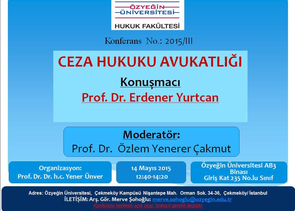Prof. Dr. Erdener Yurtcan tarafından verilecek olan Ceza Hukuku Avukatlığı konulu konferans 14.05.2015 tarihinde yapılacaktır.