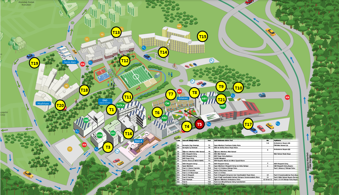 Acil durumlarda haberleşmeyi sağlamak için, kampüs geneline acil durum telefonları yerleştirilmiş ve bu telefonlarla iletişimin sağlanarak müdahale sürecini yönetmesi için güvenlik merkezi görevlendirilmiştir. Acil durum anında bu telefonları kaldırarak sakince kendinizi tanıtın, durum hakkında bilgi verin ve lokasyonunuzu net bir şekilde belirtin, bu sayede güvenlik merkezi görevlileri, olay yerine en hızlı şekilde acil durum ekiplerini (Söndürme, koruma, kurtarma, ilk yardım) yönlendirecektir.