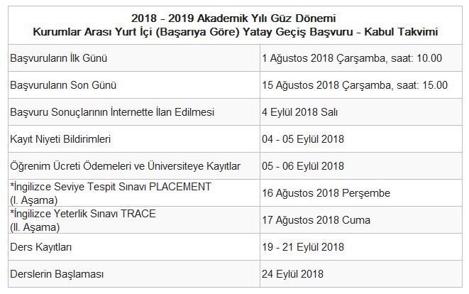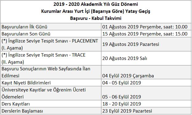 Dil yeterliğini gösterir geçerli belgesi olmayan adaylar başvuru-kabul takviminde belirtilen tarihte TRACE sınavlarına girebilirler. - Hukuk lisans programı için: 2015, 2016 veya 2017 ÖSYS ile Üniversiteye yerleşerek kayıt yaptıran adayların bu programa yatay geçiş başvurusunda başarı sırası en düşük (TM-3) 150.000'inci sırada olma şartı aranır. 2018 YKS ile Üniversiteye yerleşerek kayıt yaptıran öğrencilerin bu programa yatay geçiş başvurusunda başarı sırası en düşük (EA) 190.000'inci sırada olma şartı aranır. 2019, 2020, 2021, 2022 veya 2023 yıllarında YKS ile Üniversiteye yerleşerek kayıt yaptıran öğrencilerin bu programa yatay geçiş başvurusunda başarı sırası en düşük (EA) 125.000'inci sırada olma şartı aranır.